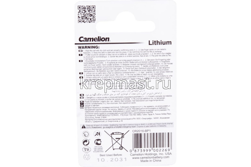 Батарейка Camelion CR2016 в интернет-магазине «Мастер Крепежа» по цене 66 руб. Более 12 наименований товаров в наличии в категории Батарейка ТАБЛЕТКА. Купить батарейка camelion cr2016 в Елабуге выгодно Вы можете on-line на нашем сайте, или отправив заявку по почте, а также по телефону или в пункте выдачи компании г. Казань, ул. Татарстан, 9, магазин "Мастер Крепежа". Доставка по Республике Татарстан и другие регионы РФ.