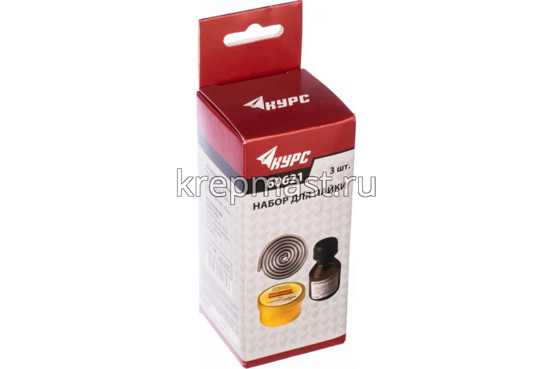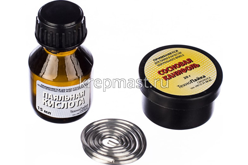 Набор для пайки КУРС № 1 припой ПОС-61 10 гр. ; канифоль сосновая 20 гр. ; кислота паяльная 15 мл включает в себя припой, канифоль и паяльную кислоту для проведения паяльных работ.