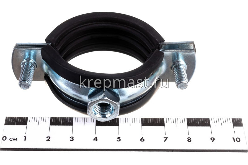 Хомут сантехнический с гайкой 40-45 мм представляет собой две металлические пластины, соединенные по краям регулировочными винтами м6 и резиновым уплотнителем. К хомуту приварена гайка м8 с метрической резьбой. Диаметр обжима трубы составляет от 40 до 45 мм. Изготавливается из оцинкованной стали толщиной 1.2 мм.