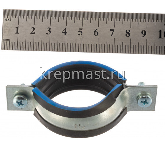 Хомут сантехнический с гайкой 48-52 мм представляет собой две металлические пластины, соединенные по краям регулировочными винтами м6 и резиновым уплотнителем. К хомуту приварена гайка м8 с метрической резьбой. Диаметр обжима трубы составляет от 48 до 52 мм. Изготавливается из оцинкованной стали толщиной 1.2 мм.
