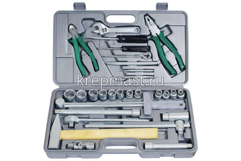 | Комплектация | Головки торцовые, 12 шт.: 8, 10, 11, 12, 13, 14, 15, 17, 19, 22, 24, 27 мм. Головка свечная 21 мм Удлинители, 2 шт.: 125, 250 мм Вороток Т-образный Шарнир карданный Плоскогубцы 200 мм Кусачки 160 мм Ключ разводной 150 мм, размер под ключ до 19 мм Зубило плоское 16х160 мм Кернер 3,2 мм Бородок 2 мм Чертилка Отвертки плоские, 2 шт.: 0,6х4,0; 1,0х6,0 мм Молоток - 400 г Ключ динамометрический шкальный КМШ 140 - 1/2" - 20-110 Нм Пластиковый кейс |