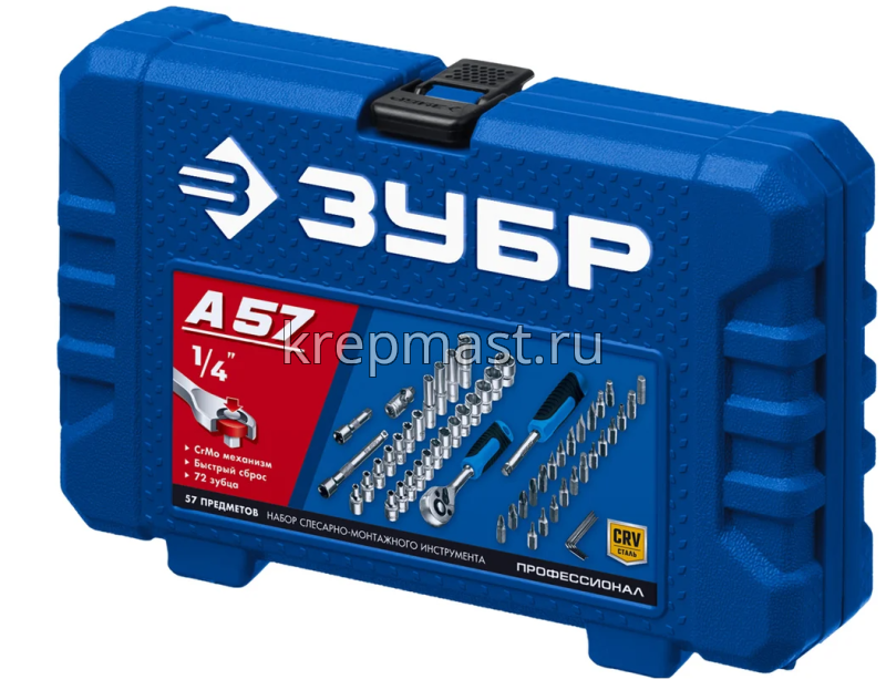 Набор ЗУБР универсальный А-57, 57 предметов (1/4) используется для профессиональных задач. Предназначен для выполнения слесарных, монтажных и ремонтных работ. Закаленные рабочие поверхности имеют высокий ресурс.