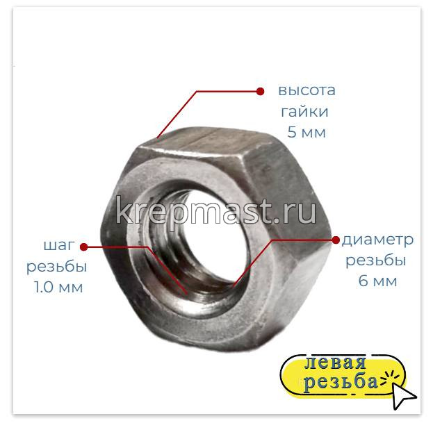 Гайка с левой резьбой (LH) М 6 c шагом 1,0 мм DIN 934 применяется в машиностроении, для сборки деревянных и металлических конструкций, мебели, в монтаже вентиляционных и холодильных систем, бытовых кондиционеров.