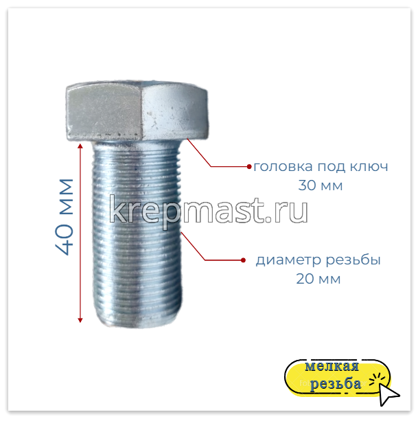 Болт DIN 961 20х 40х1,5 кл.пр. 10,9 ОЦИНК. п/р с мелкой резьбой в интернет-магазине «Мастер Крепежа» по цене 390 руб. Более 6 наименований товаров в наличии в категории Болты 20мм с мелкой резьбой. Купить болт din 961 20х 40х1,5 кл.пр. 10,9 оцинк. п/р с мелкой резьбой в Елабуге выгодно Вы можете on-line на нашем сайте, или отправив заявку по почте, а также по телефону или в пункте выдачи компании г. Казань, ул. Татарстан, 9, магазин "Мастер Крепежа". Доставка по Республике Татарстан и другие регионы РФ.