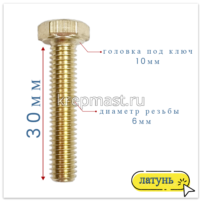 Болт 6х30 DIN 933 латунь в интернет-магазине «Мастер Крепежа» по цене 61 руб. Более 26 наименований товаров в наличии в категории Болты латунные DIN 933. Купить болт 6х30 din 933 латунь в Елабуге выгодно Вы можете on-line на нашем сайте, или отправив заявку по почте, а также по телефону или в пункте выдачи компании г. Казань, ул. Татарстан, 9, магазин "Мастер Крепежа". Доставка по Республике Татарстан и другие регионы РФ.