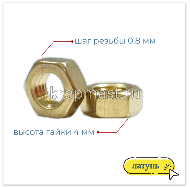 Гайка 6-гр. М 5 (0,8) латунь DIN 934 в интернет-магазине «Мастер Крепежа» по цене 18 руб. Более 7 наименований товаров в наличии в категории Гайки латунные DIN 934 (ГОСТ 5927) . Купить гайка 6-гр. м 5 (0,8) латунь din 934 в Елабуге выгодно Вы можете on-line на нашем сайте, или отправив заявку по почте, а также по телефону или в пункте выдачи компании г. Казань, ул. Татарстан, 9, магазин "Мастер Крепежа". Доставка по Республике Татарстан и другие регионы РФ.