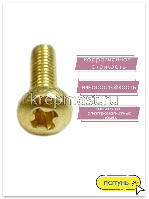Винт латунный с полукруглой головкой DIN 7985 / ГОСТ 17475 М 2,5 х 8 используется в случае, когда необходимо создать немагнитный узел. Латунный винт применяется в приборостроении, авиации, атомной промышленности. Латунный крепеж стоек к органическим кислотам и углекислым растворам.
