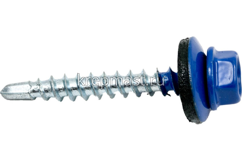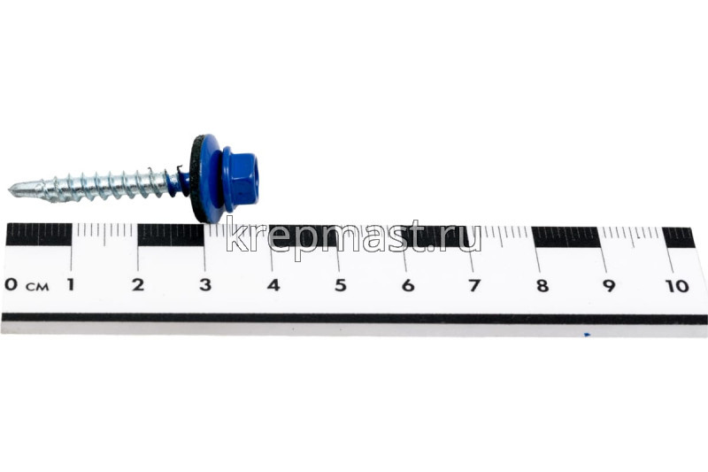 Кровельный саморез окрашенный с шайбой и резиновой прокладкой EPDM DIN 7504 4,8 х 35 по дереву RAL 5002 (цвет светло - синий) - представляет из себя саморез с шестигранной головкой, фланцем и резиновой прокладкой для эффективного прижатия листового металла к основанию.