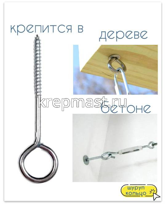 Шуруп-кольцо 5,0 х 30применяется для монтажа в бетонные и кирпичные основания с помощью пластиковых дюбелей, а также в деревянные конструкции, в предварительно просверленное отверстие. Шуруп-кольцо используется для монтажа тросов и канатов, фиксации легких строительных лесов и стеллажей к стенам, а также для подвешивания предметов к потолку и стенам.