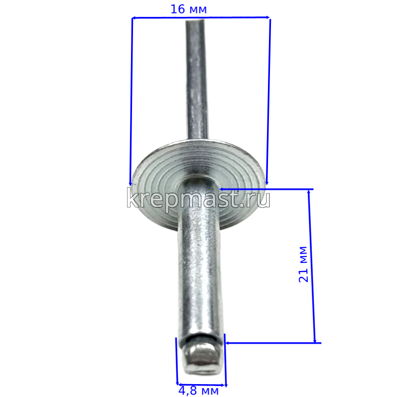 Заклёпка сталь/сталь 4,8х21х16 широкий борт - применяется для создания неразъемных соединений листовых металлов в машиностроении, приборостроении и строительных отраслях.