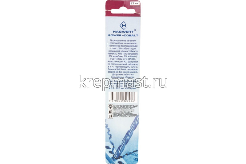 Кобальтовое сверло по металлу М12.0 x151мм Hagwert изготовлено из быстрорежущей стали HSS с 5% добавкой кобальта, что обуславливает высокую прочность и долгий срок службы оснастки. Сверло шлифованное и имеет цилиндрический хвостовик. Подходит для сверления труднообрабатываемых и нержавеющих сталей, цветных металлов. Угол заточки при вершине — 135 градусов, а класс точности — А1.