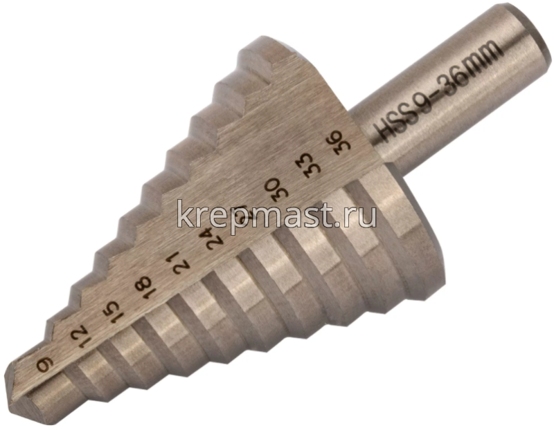 Количество ступеней — 9 шт. Диаметры ступеней: 9 мм; 12 мм; 15 мм; 18 мм; 21 мм; 24 мм; 27 мм; 33 мм; 36 мм.