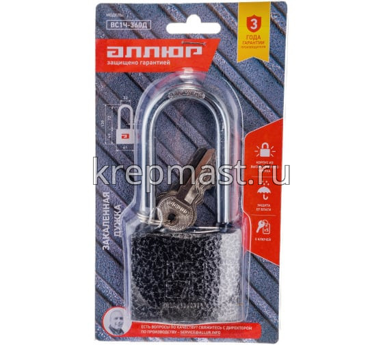 Навесной замок Аллюр ВС1Ч-360Д используют в качестве дверного висячего замка для нежилых подсобных помещений, кладовки, сарая или бани. Закаленная длинная дужка из стали обладает высокой устойчивостью ко взлому и распиливанию.