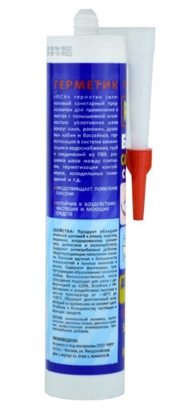 Герметик РИЧ санитарный 280мл белый, 280 мл. предназначен для применения в местах с повышенной влажностью: уплотнение швов вокруг ванн, раковин, душевых кабин и бассейнов, герметизация в системе канализации и водоснабжения, труб и соединений из ПВХ, расшивка швов между плитками, герметизация контейнеров, холодильных помещений и т.д. Предотвращает появление плесени. Устойчив к воздействию чистящих и моющих средств. Высокоэластичный, после отвердевания подходит для швов с деформацией. Устойчив к УФ излучению и воздействию высоких и низких температур. Образует долговечный шов, который со временем не меняет цвет. Продукт обладает отличной адгезией к стеклу, кирпичу, керамике, анодированому алюминию, древесине и поликарбонату.