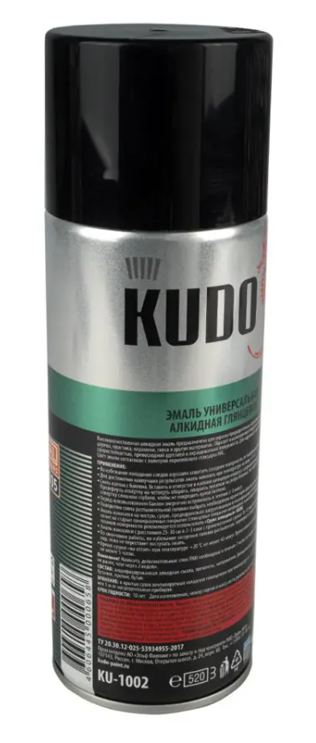 Краска KUDO черная RAL 9005 - высокопрочная универсальная глянцевая аэрозольная эмаль в баллончике, предназначенная для окраски предварительно загрунтованных металлических и деревянных поверхностей. Аэрозольная краска легко наносится на труднодоступные места. Образует долговечное покрытие с хорошей укрывистостью, атмосферостойкостью, превосходной адгезией к окрашиваемой поверхности. Применяется для наружных и внутренних работ.