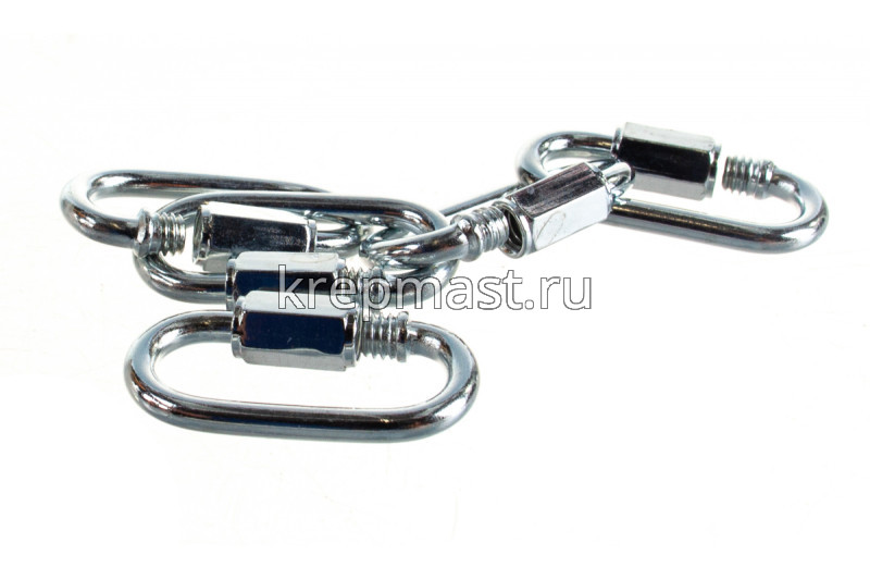 Соединитель цепей с гайкой 4мм (карабин винтовой) - cтальной карабин "звено цепи" с винтовой муфтой (фиксатором) применяется для быстрого и надежного крепления тросов и цепей между собой или к чему-либо. Размер карабина определяется по диаметру поперечного сечения проволоки (прутка) и составляет 4 мм.